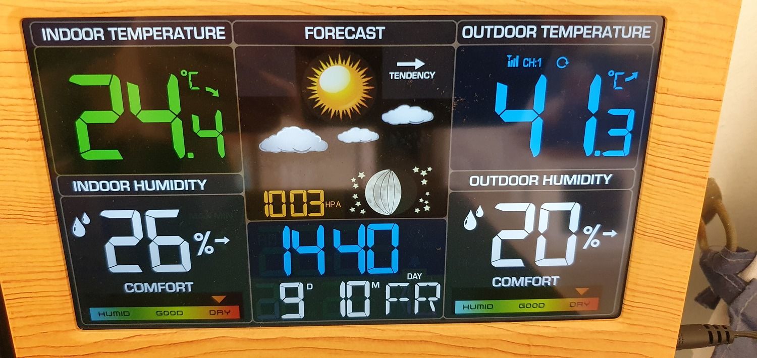 עם 38 (הטמפ' ממשיכה לטפס לאט ובטוח, כבר 38.6°) וכ-7 שעות עם לחות ברצפה 10%, יום רותח וקשוח.
