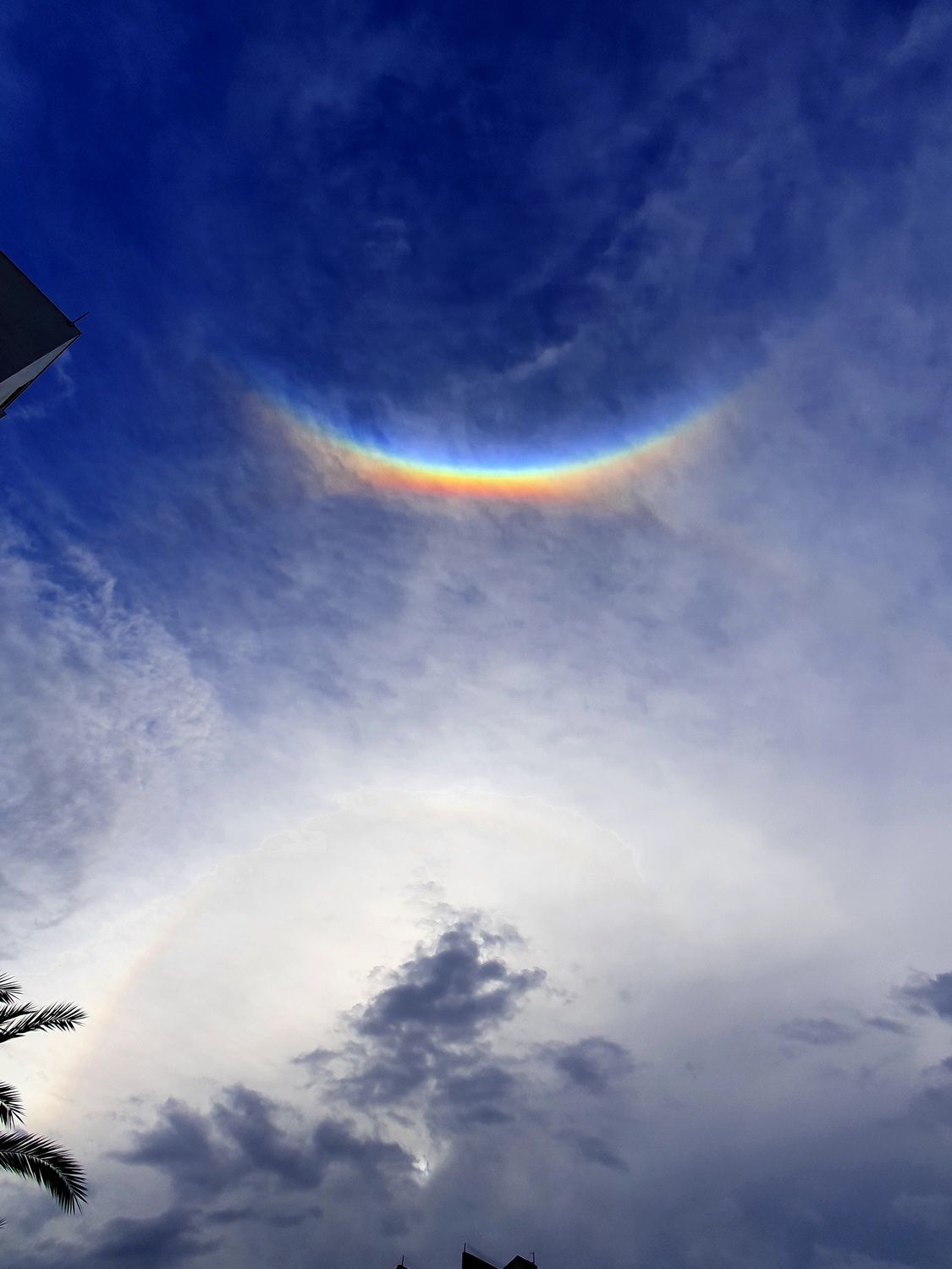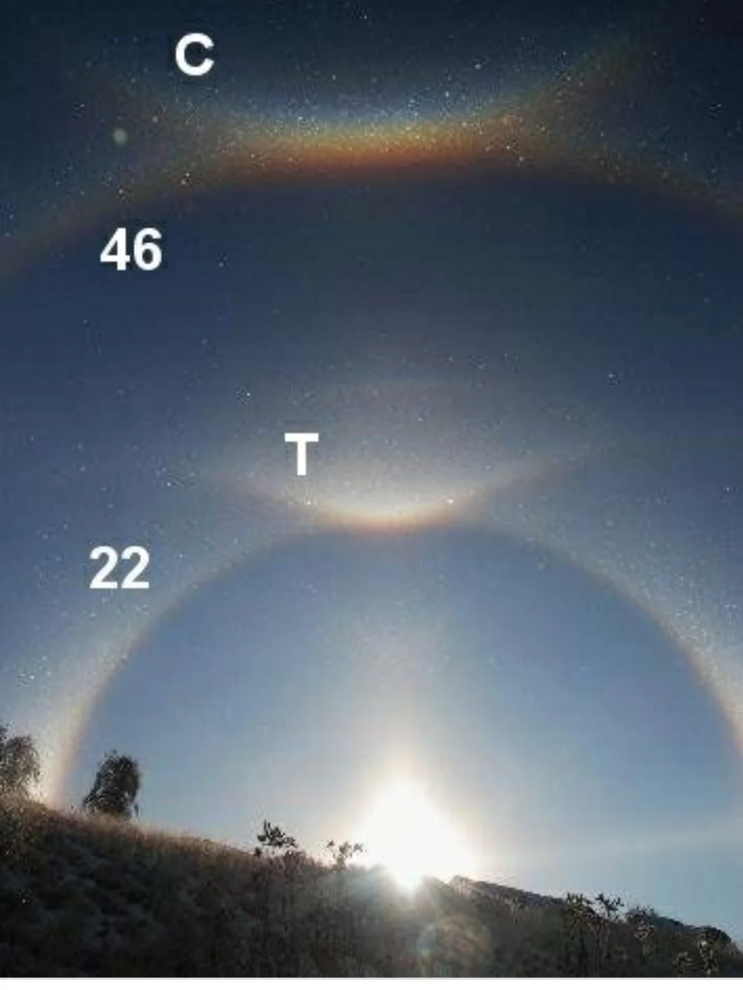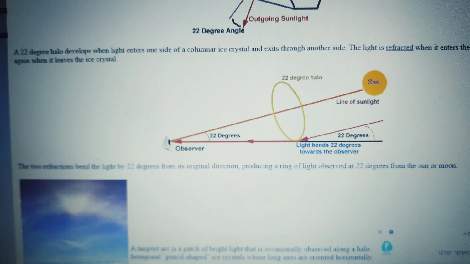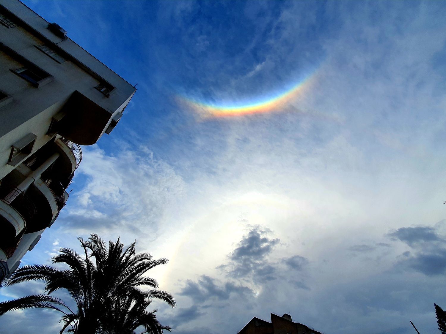 בתחתית התמונה- השמש עם הילה סביבה (הילת 22?), ובמקביל קשת בעננים שהמרכז שלה נראה לכיוון ההפוך מהשמש.