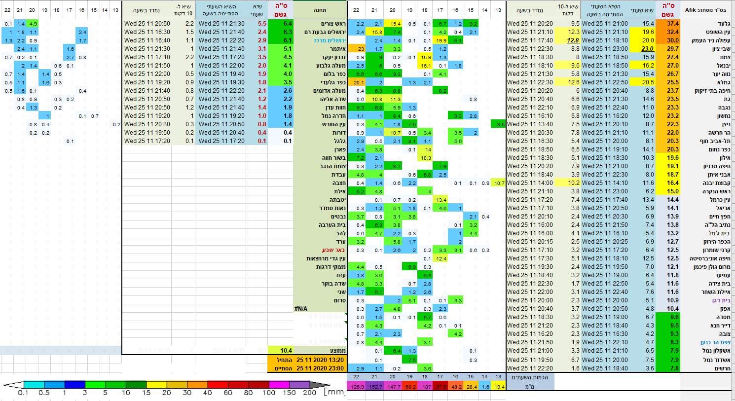 - טבלת משקעים עם שיאי עוצמות הגשם משה
