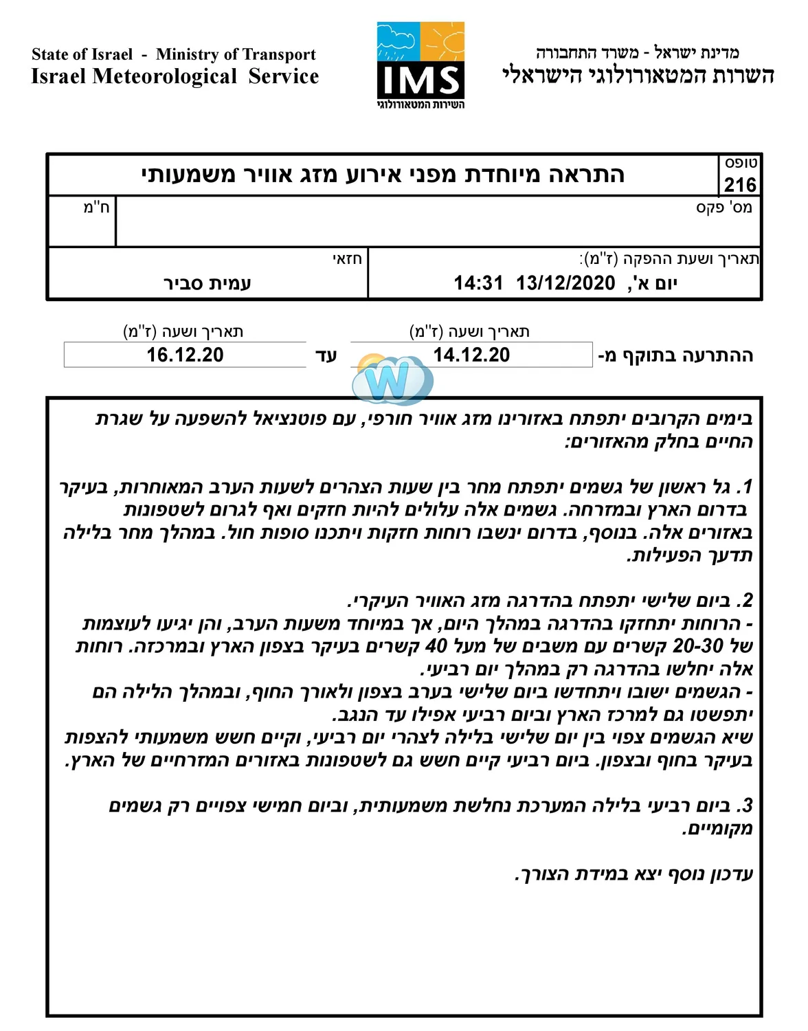- השירות המטאורולוגי: התראה מיוחדת מפני אירוע מזג אוויר משמעותי 14-16.12.2020 Weather2day