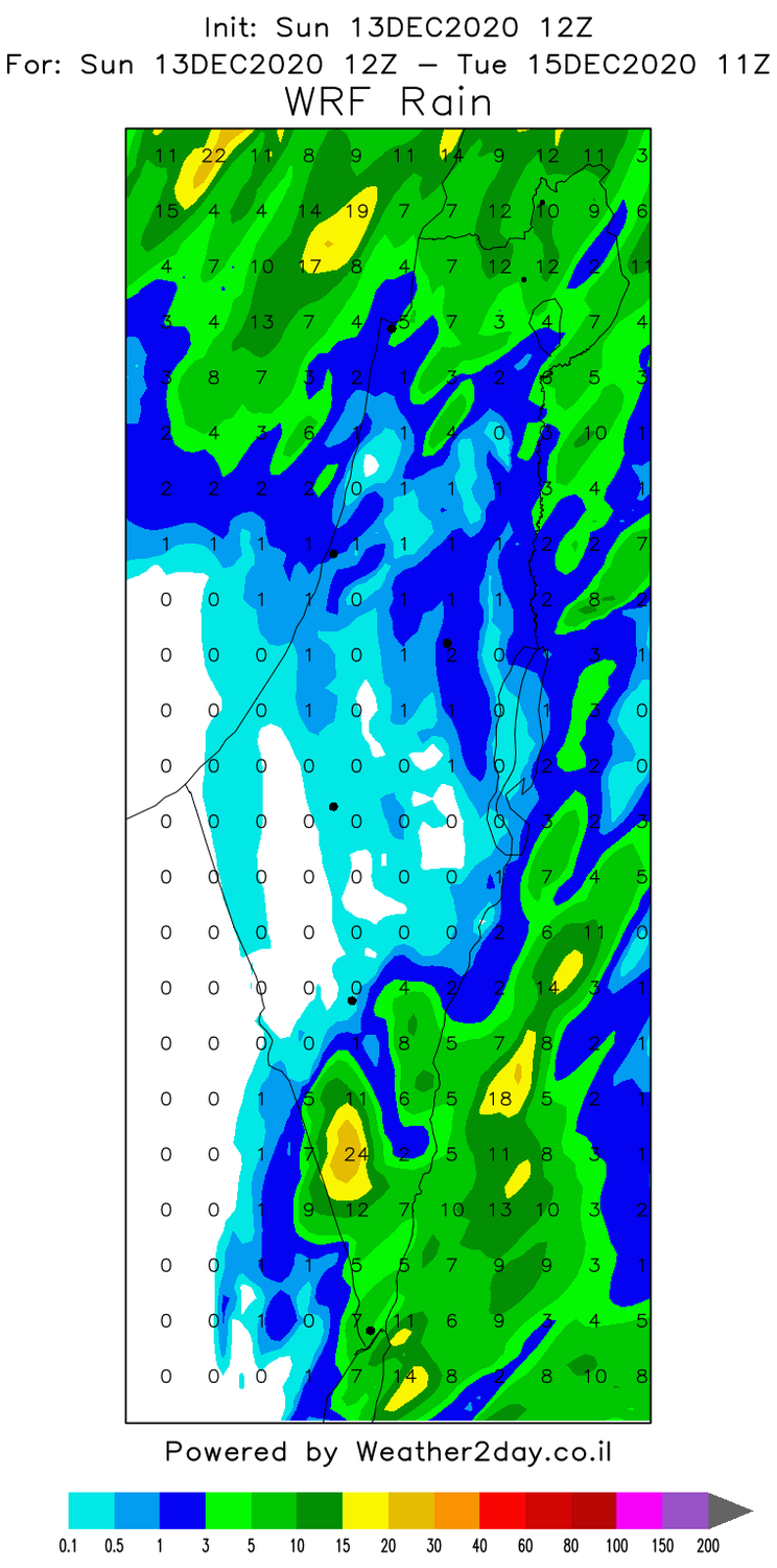 ולא צפוי שם יותר מ-10/15 מ"מ ואלי אף פחות( לפי איסי). בצפון ובעיקר בחוף המרכזי לעומת זאת צפוי עשרות מ"מ ולפי האמריקאי השיאניות בחוף הצפוני עם עד 60 מ"מ.