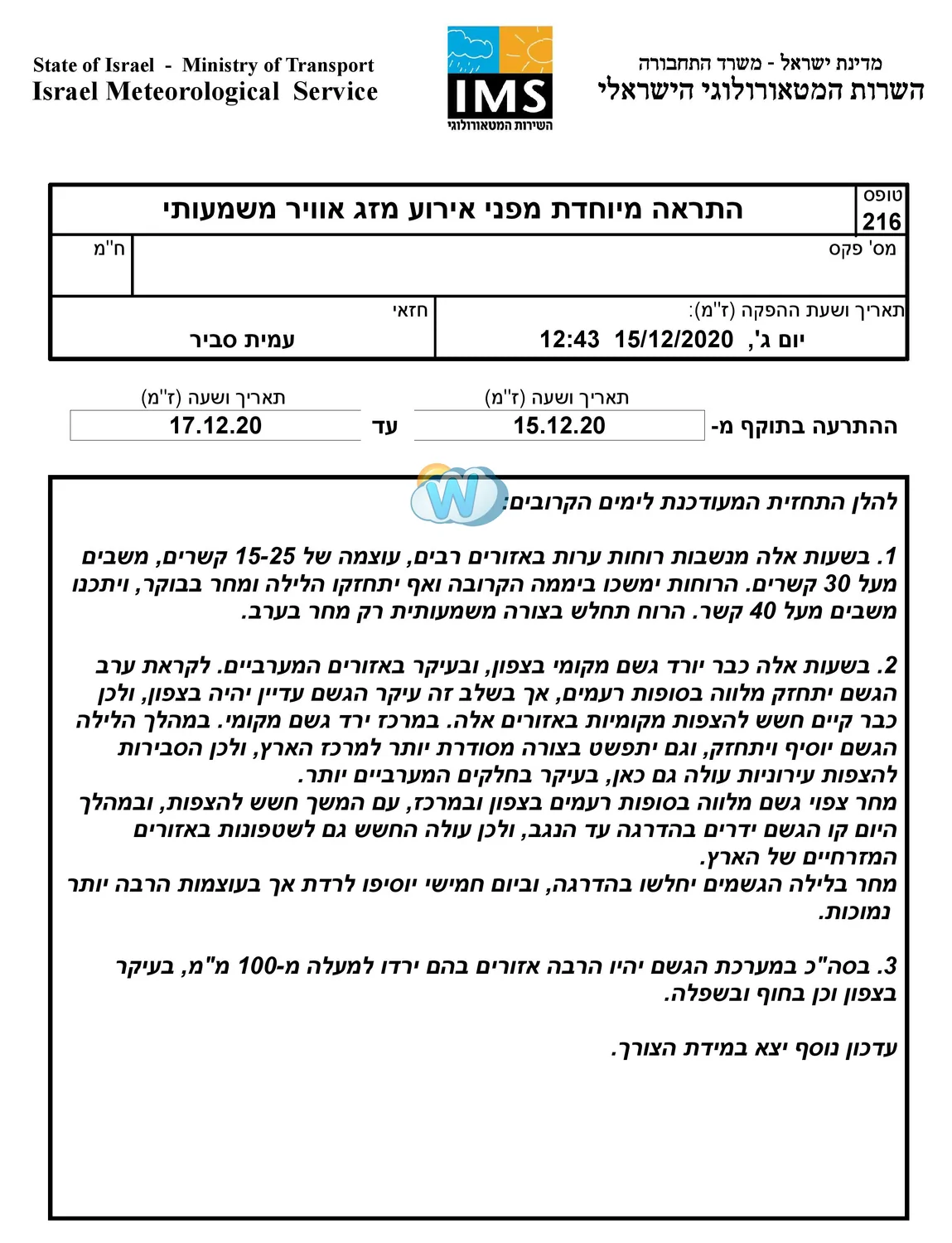 עדכון התראה השירות המטאורולוגי - 15/12/2020