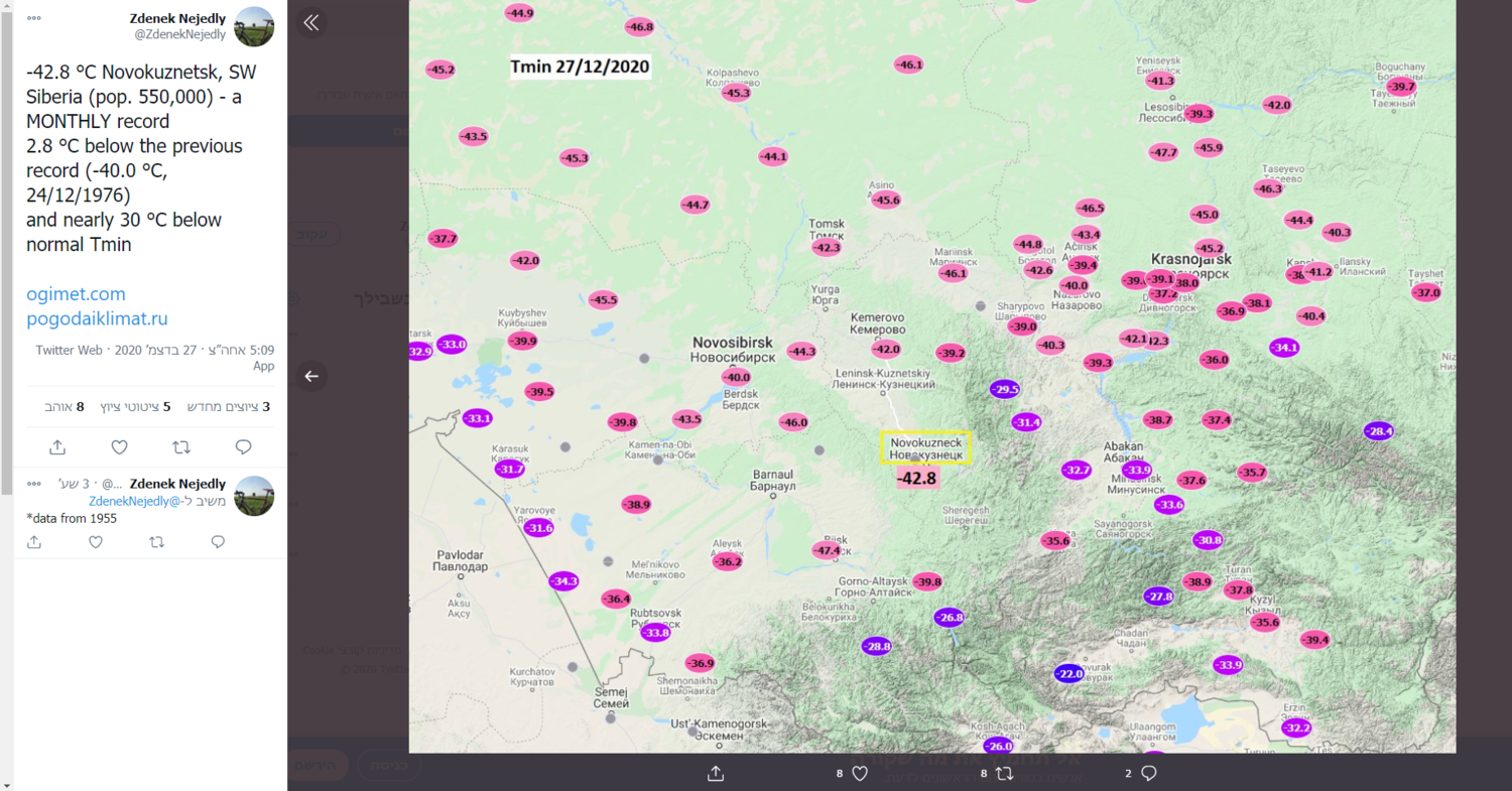 ולמי ששואל איפה הקור התשובה היא במקום האחרון שרוצים עוד קור. דרום סיביר עם גלי קור שמורידים את הטמפרטורה ל10 מעלות פחות מהממוצע ואף יותר.