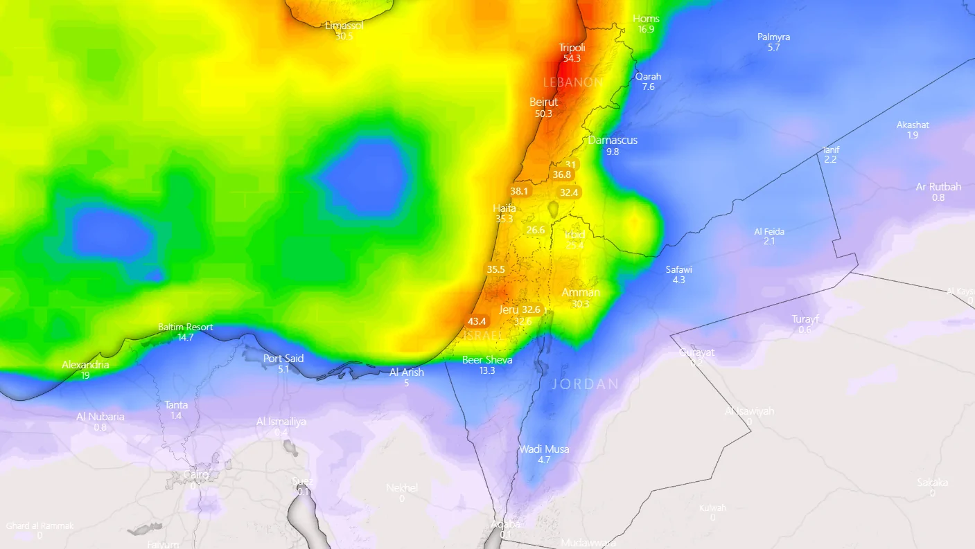 צפי משקעים מצטבר ל-10 ימים (ECMWF).