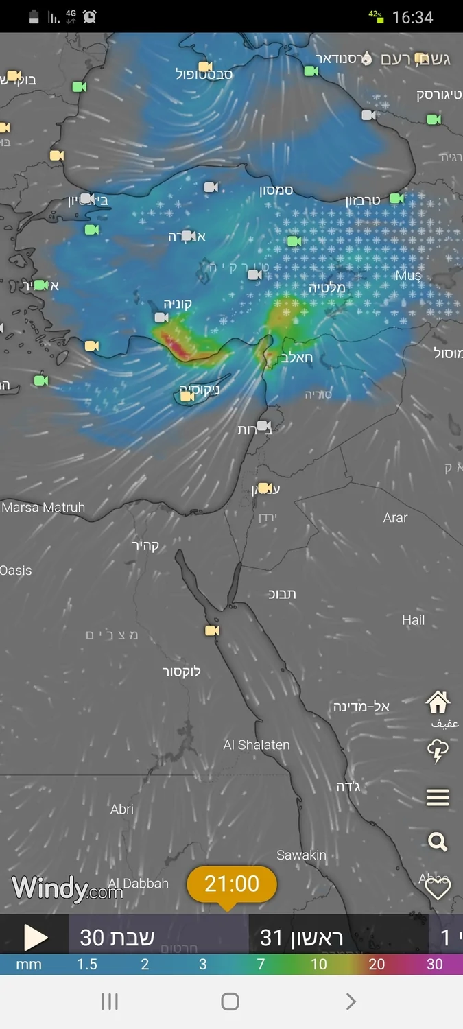 שינוי במזג האוויר. במהלך היום אפיק קר שנמתח מטורקיה עד לישראל מתקרב לאיזורינו. הפעילות הקרה הזו צפויה להוריד שלגים ברחבי טורקיה בעוד בישראל נקבל את קצה הפעילות הזו שתתבטא בקו גשמים ראשון מלווה בסופות רעמים בודדות שיכנס לקראת שעות הלילה של יום רביעי. החזית הזו צפויה להיכנס מהר מאוד מצפון ועד לצפון הנגב בהתאמה במשך הלילה. חלק מהגשמים צפויים להדרים אף מעבר לקו הנגב לקראת שעות הבוקר ולכן קיים חשש משיטפונות בנחלי הדרום.
