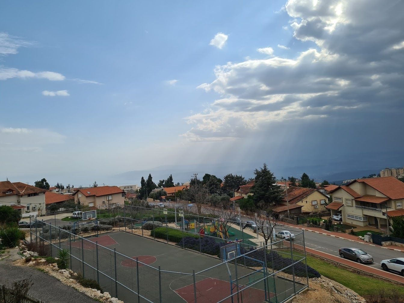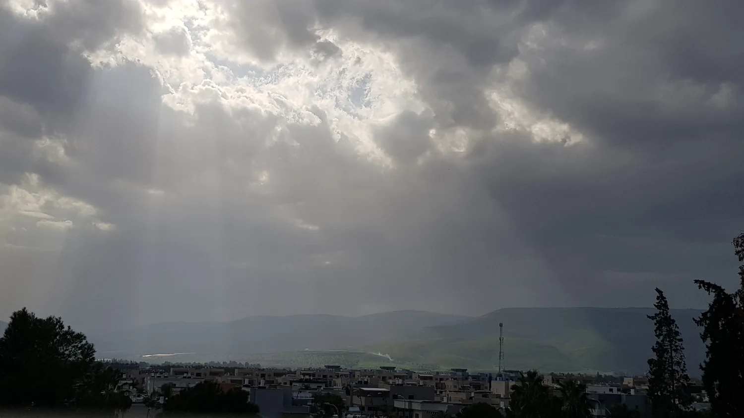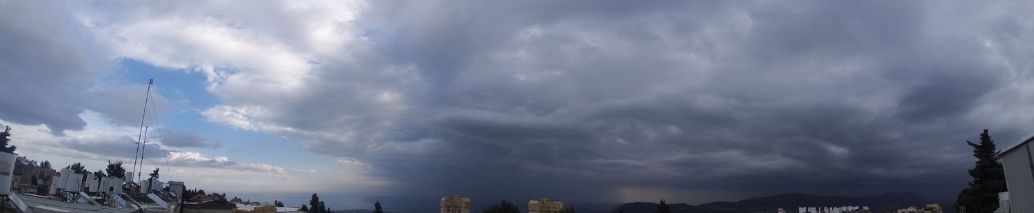 שימו לב למכם הגשם כיצד העננים מתמקדים בחלק המערבי של הארץ ובמקביל תמונה פונרמית שצולמה מצפת לכיוון דרום כמשמאל שמים בהירים ומימין עננות כבדה (בצפת עצמה לא ירד מהבוקר כלום.)
