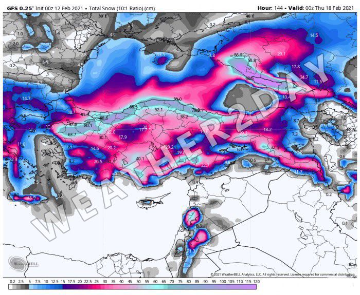 טווח 144 שעות (תמונה #1) המודל האמריקאי (GFS) מציג תמונה דלה יותר באשר לשלג. אנחנו מדלגים בשלב הזה על עדכון הצהריים כך שמבחינתנו העדכון הבא יהיה בשעה 18:00.