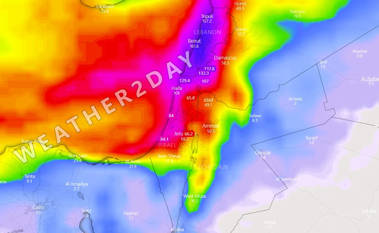 הצפי משתפר משמעותית, כמויות של 80+ במצטבר במישור החוף, בצפון מעל 100 מ"מ ובשדרת ההר סביב 60 מ"מ. קו חיתוך המשקעים באיזור צפון הנגב.
