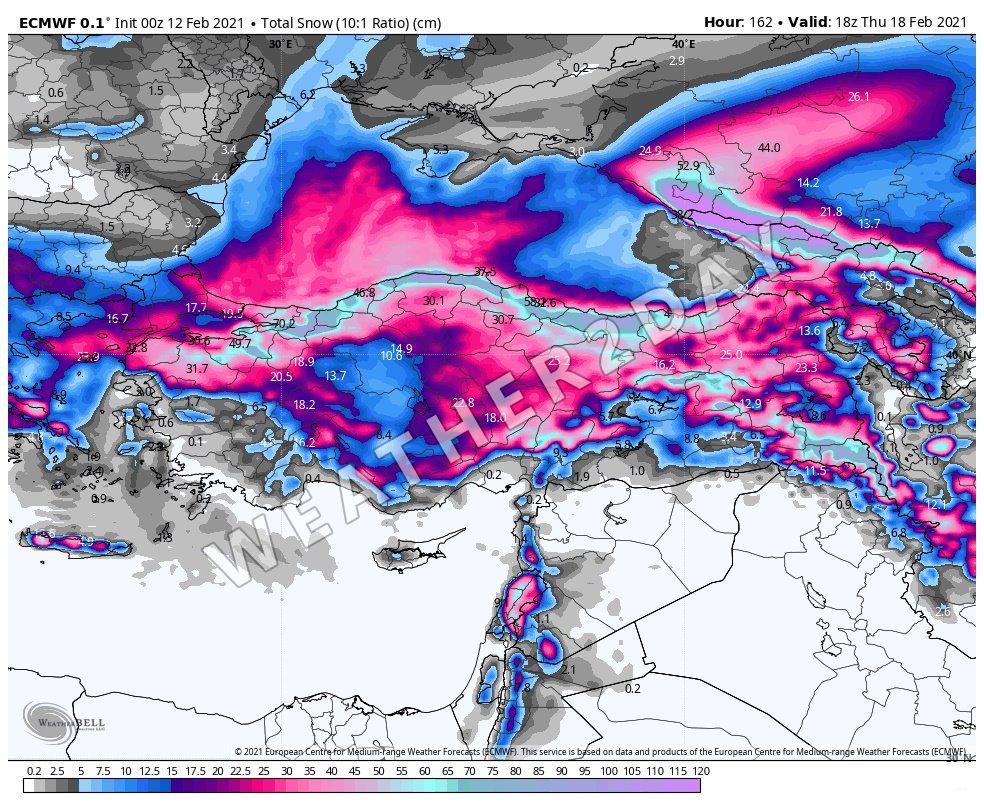 טווח 168 שעות מצטבר (תמונה #2) המודל האירופאי (ECMWF) מציג שיפור בתנאי השלג עם הצטברות של בין 5-10 ס"מ של שלג בירושלים והרי המרכז ומצב דומה בהרי הגליל. בחרמון ובצפון הגולן ההיערמות גדולה יותר.