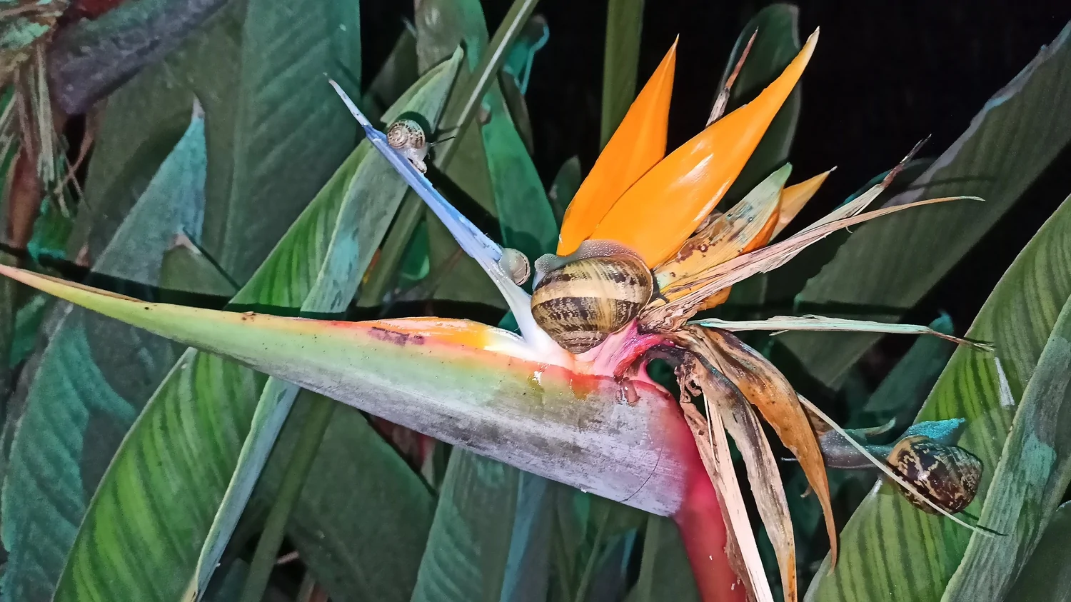 החלזונות אוהבים במיוחד את הפרחים של ציפור גן העדן ושורצים עליהם בהמוניהם.