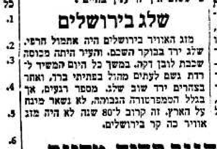 היום לפני 72 שנה ירד שלג בירושלים (06/04/1949). מצורפת כתבה מיום המחרת (07/04/49) בעיתון הארץ.