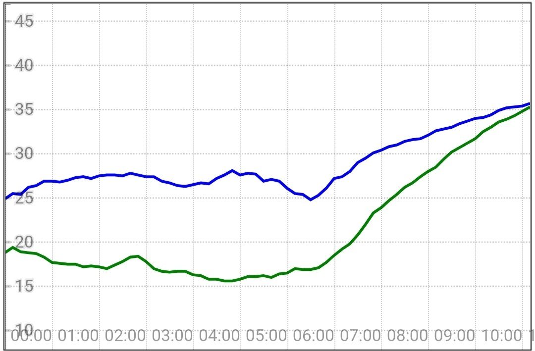 הטמפרטורות באילת (בכחול) נגד הטמפרטורות בקיבוץ גלגל (בירוק) ב-24 השעות האחרונות. בשעה 12:10 הטמפרטורה באילת הייתה 35.7⁰ ובגלגל 35.3⁰.