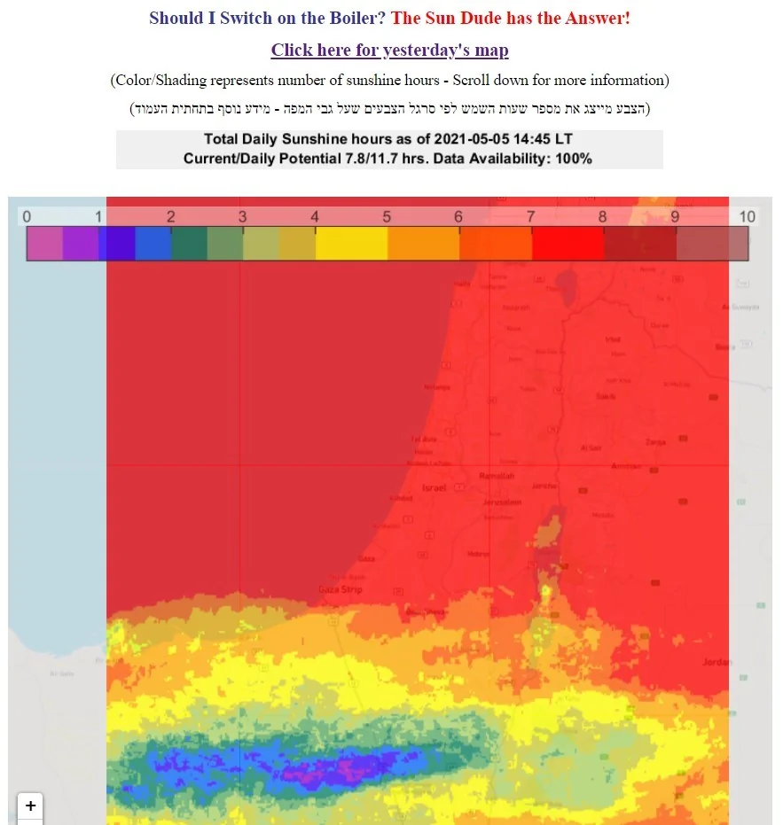 אגב, תוצר נוסף של עיבוד נתוני הלוויין שזמין לציבור, הוא חישוב יומי מצטבר של שעות השמש. המפה מתעדכנת בזמן אמת ומכסה את כל הארץ.