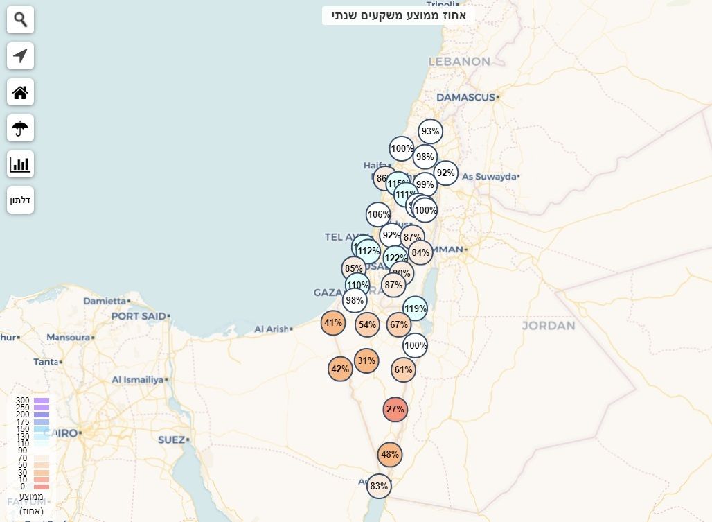 - עונת המשקעים 2020/21 - אחוז מהממוצע השנתי Weather2day