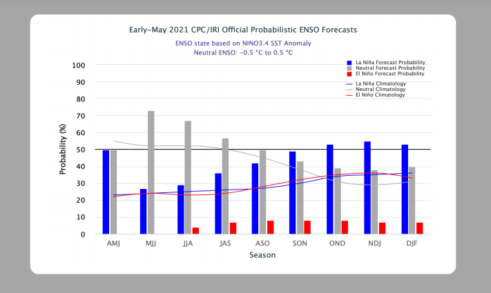 אני מצרף תמונה מהעדכון השבועי של Noaa. כל שבוע Noaa מוציעה עדכון שבועי כאשר אחד הגרפים מכיל גרף עמודות שמציג את הסיכוי המוערך למצב מסוים בחודש x.