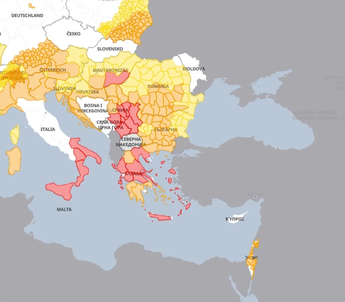 מישראל ועד איטליה יחוו השבוע טמפרטורות גבוהות בשל לחץ גבוה חזק אשר מתבסס ברום הגבוה מעל מזרח הים התיכון. במפה המצורפת למטה אפשר לראות את השפעתו ב-3 רמות לפי איזורים מחולק לצהוב, כתום ואדום כאשר האחרון מסמל את הדרגה החמורה ביותר לאזהרת מזג אוויר קיצון, ניתן לראות בבירור שאזהרת הקיצון המשמעותית היא למעשה באיזור יוון, איטליה והבלקן.