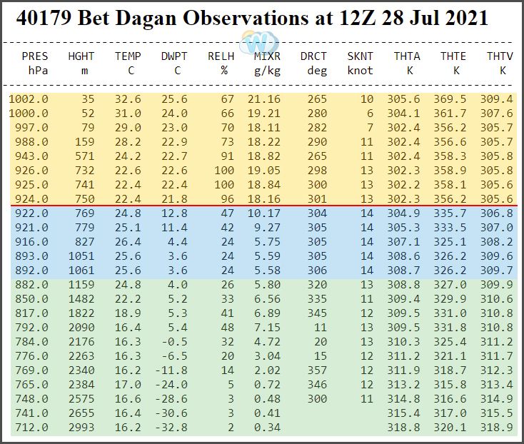 השבוע הזה לא יהיה סימפטי עבורכם בלשון המעטה, הלחות תרקיע שחקים והאינוורסיה, תקרת הזכוכית שמונעת מהלחות שמגיעה מהים להתפזר באטמוספירה תרד מתחת ל-600 מ' ותפעיל את מכבש הלחות שנהוג לכנותו - מזג אוויר הביל. בתמונה המצורפת, תוכלו לראות את שכבת האינוורסיה ביום מעודד יותר, בתקווה שהיום הזה יגיע.
