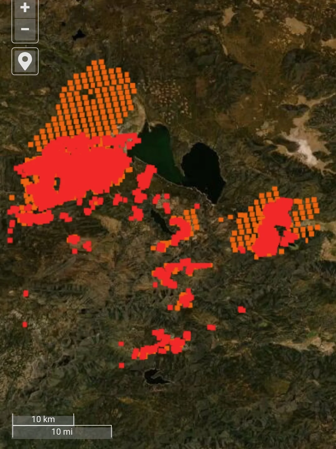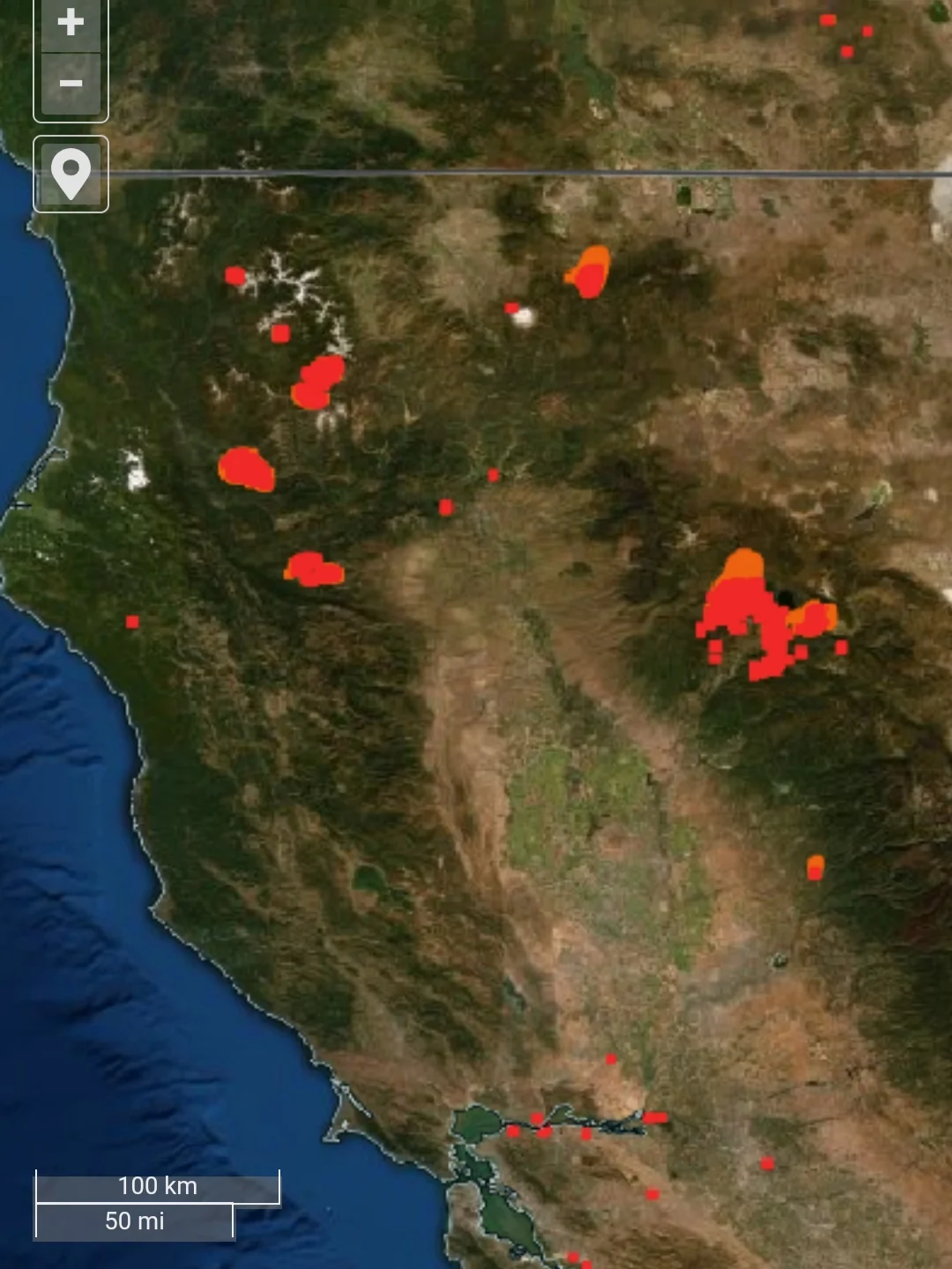 שימו לב לקנה המידה למטה משמאל שנותן מושג על היקף השריפות
