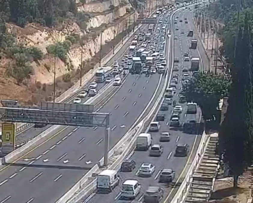כביש 1 חסום במחלף שער הגיא בעקבות תאונה, התנועה מוכוונת באיטיות דרך תחנת הדלק (ראו תמונה).