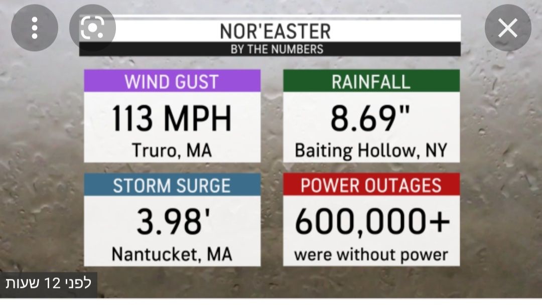 - הסופה בים מול צפון מזרח ארה"ב הביאה רוחות עד 150 קמש חנוך א