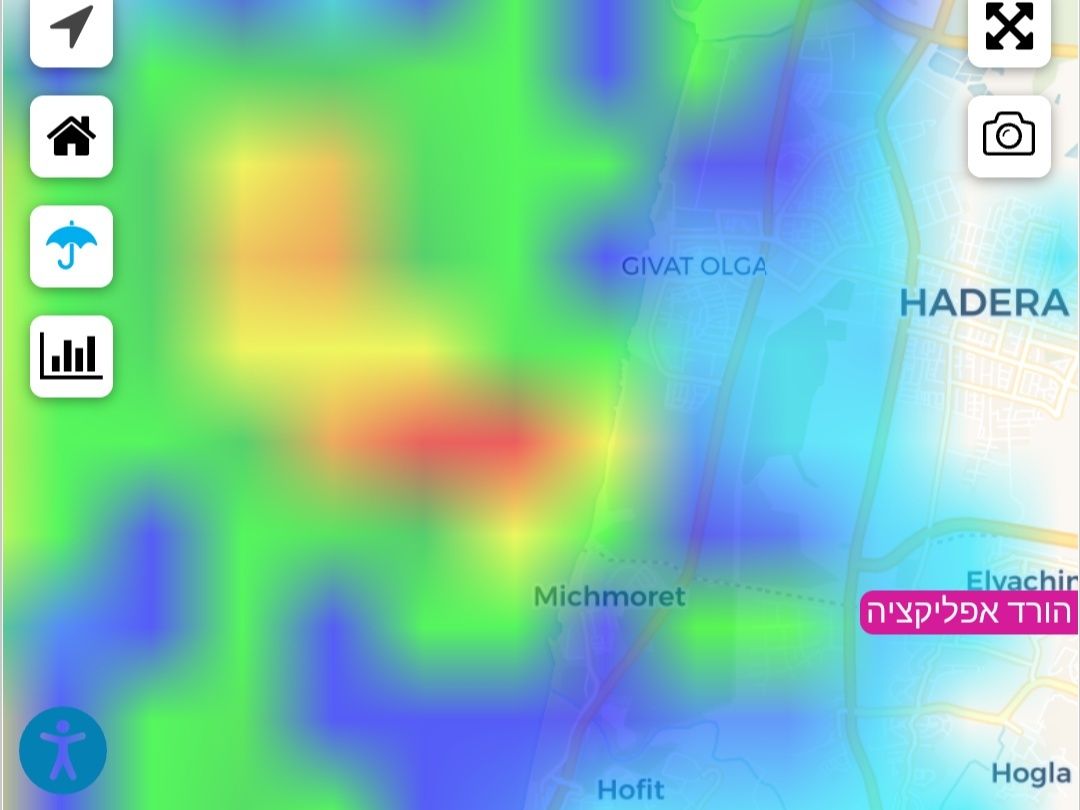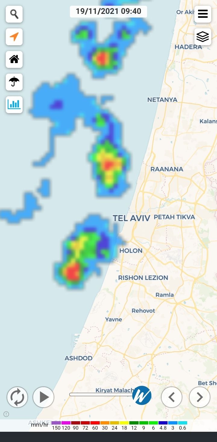 גשם בעוצמה בינונית ירג בחצי שעה האחרונה בצפון תל אביב
