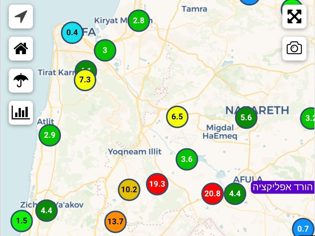כך יצא שאצלי נרשם 2.5 ממ.... ברור שמקומות אחרים ברצועה זו נמדדו 10 ממ ואף יותר... חשוב להבין, מדובה ברצועת גשם חולפת לאורך זמן קצוב של כ 15 דקות... הצבעים המופיעם במכמ מסמנים כמות ממ בשעה !.. כך שאפילו אם רשום צבע של 100 ממ... בפועל.. אם יישאר באותה נקודת זמן 10 דקות... יימדד במקום זה כ 15 ממ .... כך גם במידה והצבע הוא 20 ממ... בפועל אחרי 10 דקות שהצבע נדאר... יירשמו 2-4 ממ