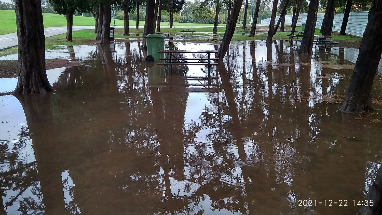 שטחי הישיבה שמסביב לאגם מכוסים במי האגם שעלה על גדותיו במקביל לירקון הסמוך לו (ואולי בגללו).