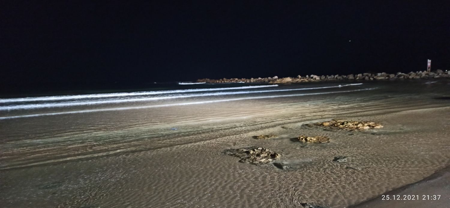 רק מצידו היבשתי. צולם בחופי בת ים הלילה.