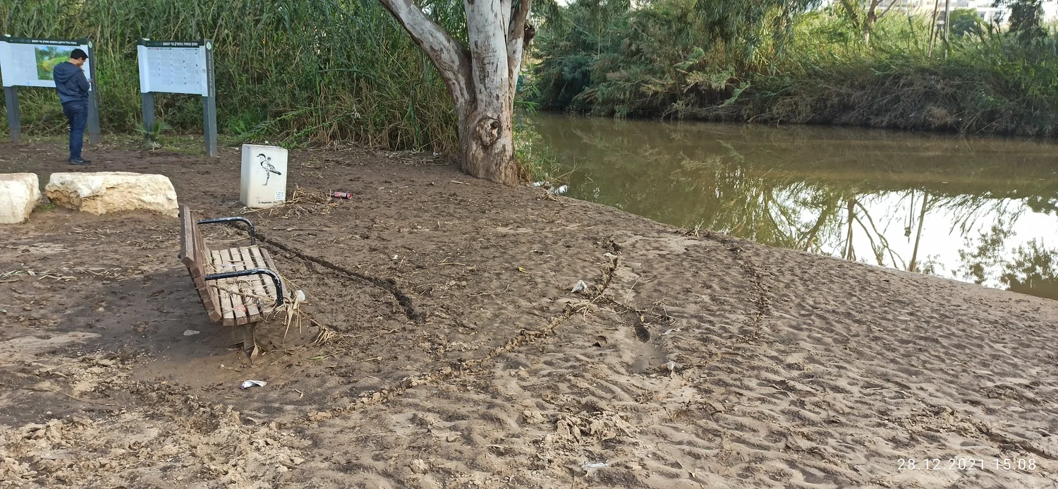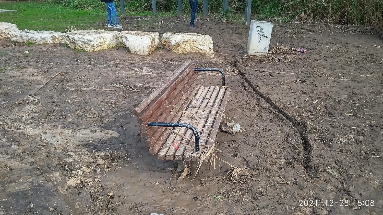 (אפשר להבחין ברגלי הספסל ששקועים בבוץ של הסחף כדי להבין באיזה רמה של בוץ/סחף מדובר. גם הספסל עצמו מכוסה בבוץ וסחף).