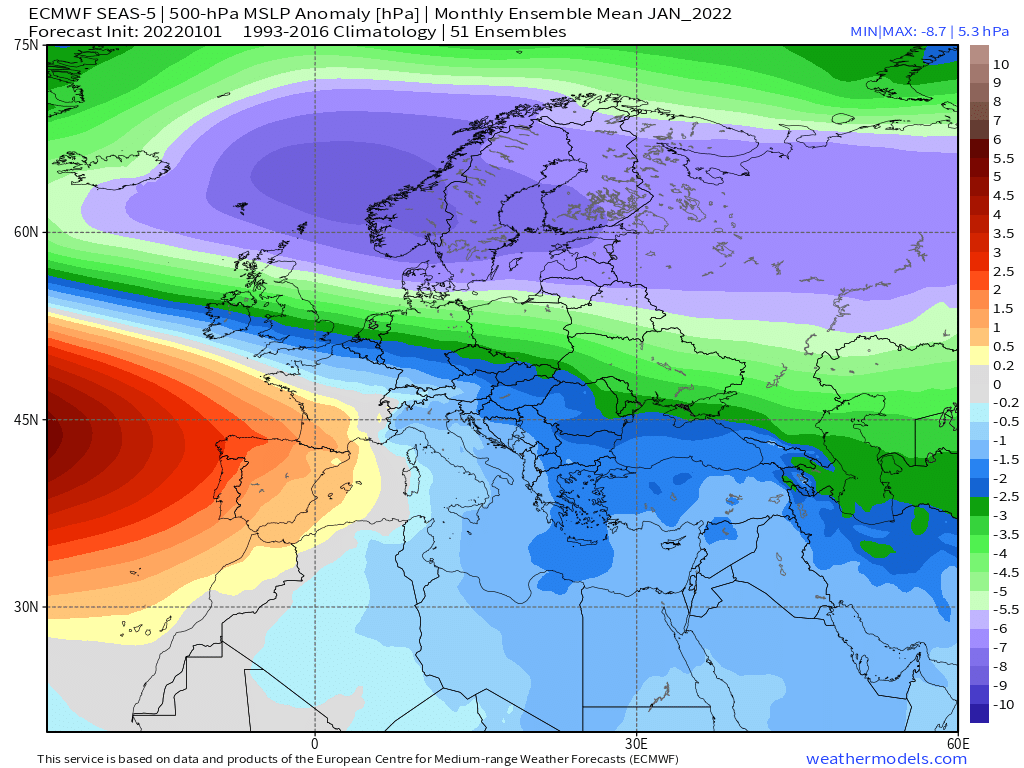 אנומליית 500 מ"ב לחודש ינואר מעידה על ערכים נמוכים במעט מהממוצע באיזורינו עם שקע רום עמוק במזרח הים התיכון.