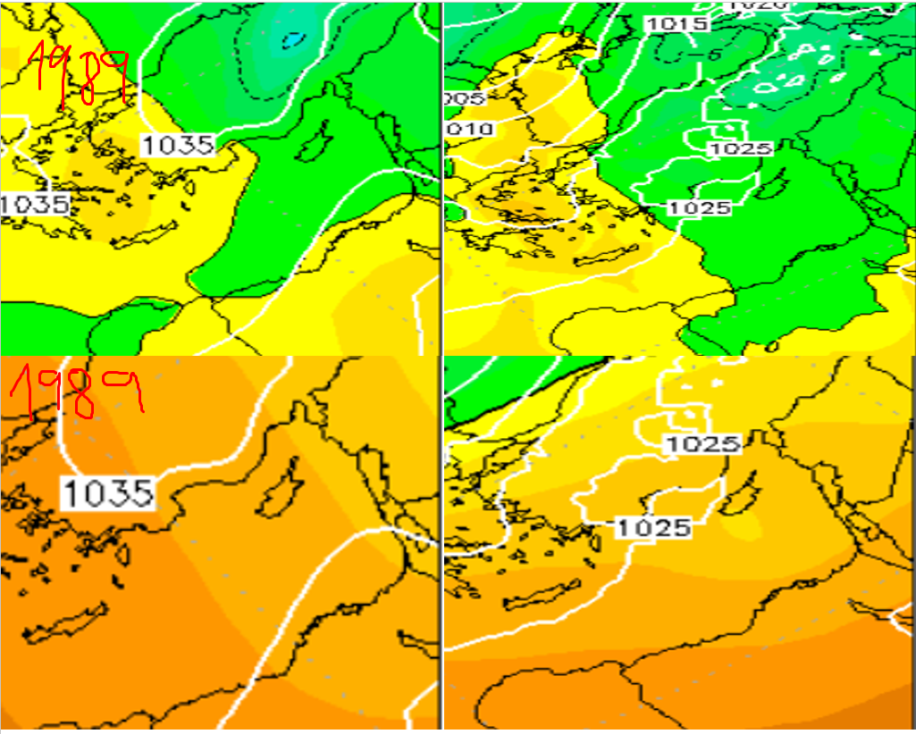 אנחנו תחת סינופטיקה של גל דוחף גל, ולכן חלק מהאפיקים ינחתו מזרחית או ירגדו אותנו מצפון. הפוטנציאל לימי קרה משמעותיים גדול מהפוטנציאל לשלג. למשל הקנדי שלרוב בעל שגיאה של מעלה פלוס, גם אם אני מתחשב בשגיאה הזאת נותן טמפרטורות קיצון בטווח ריאלי של 120 שעות. איסי פשוט מפציץ עם גל קור אכזרי ב192 שעות. אני יודע שה850 יחסית מתון על מינוס 3 עד מינוס 1 בטווח של 168 עד 192 שעות, אך לפי הסינופטיקה וערכי הלחצים במצב כזה השמיים יהיו מאוד בהירים. מזכיר לי את גל הקור של תחילת פברואר 1989. החלטתי לצרף תמונה שמשוואה בין פברואר 1989 לצפי של איסי ל8 ימים. מצד שמאל פברואר 1989 מצד ימין הצפי של איסי. השמיים ב1989 היו יותר נקיים אך הטמפרטורה של שכבת האוויר יותר קרה בצפי הנוכחי ויש לנו יתרון של שבועיים בקרבה למינימום שעות השמש.
