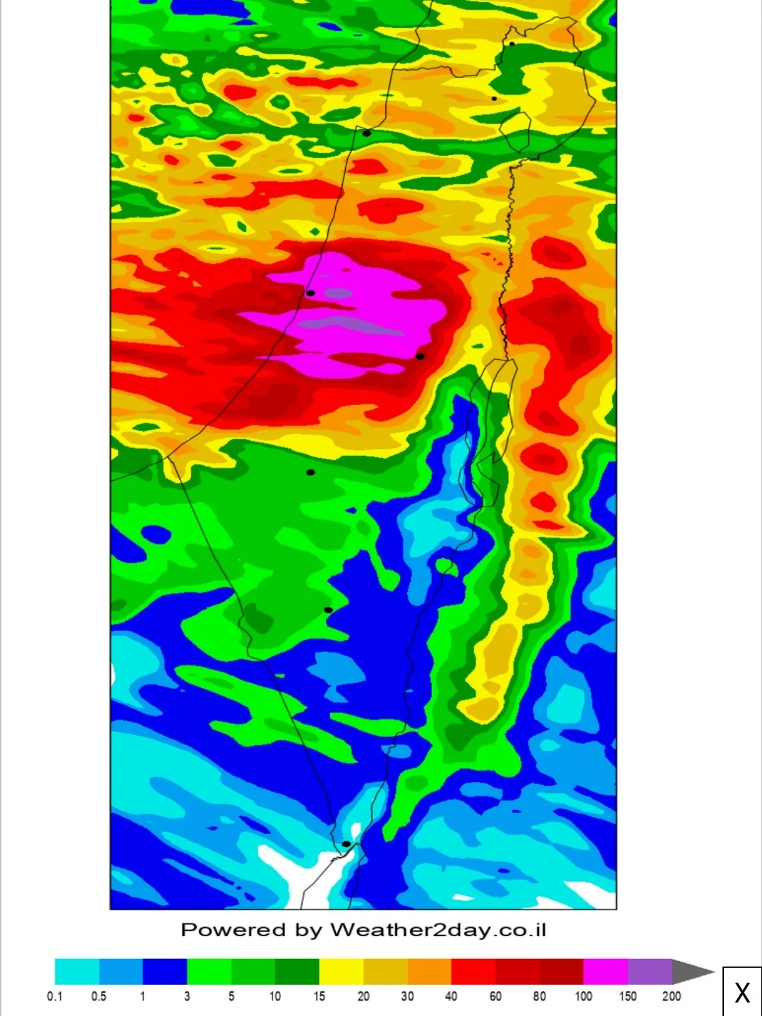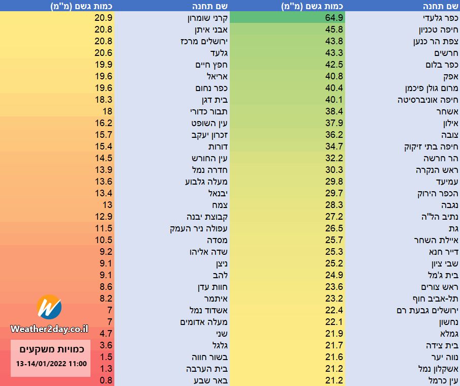 - טבלת המשקעים 13-14/01/2022 עד השעה 11:00 Weather2day