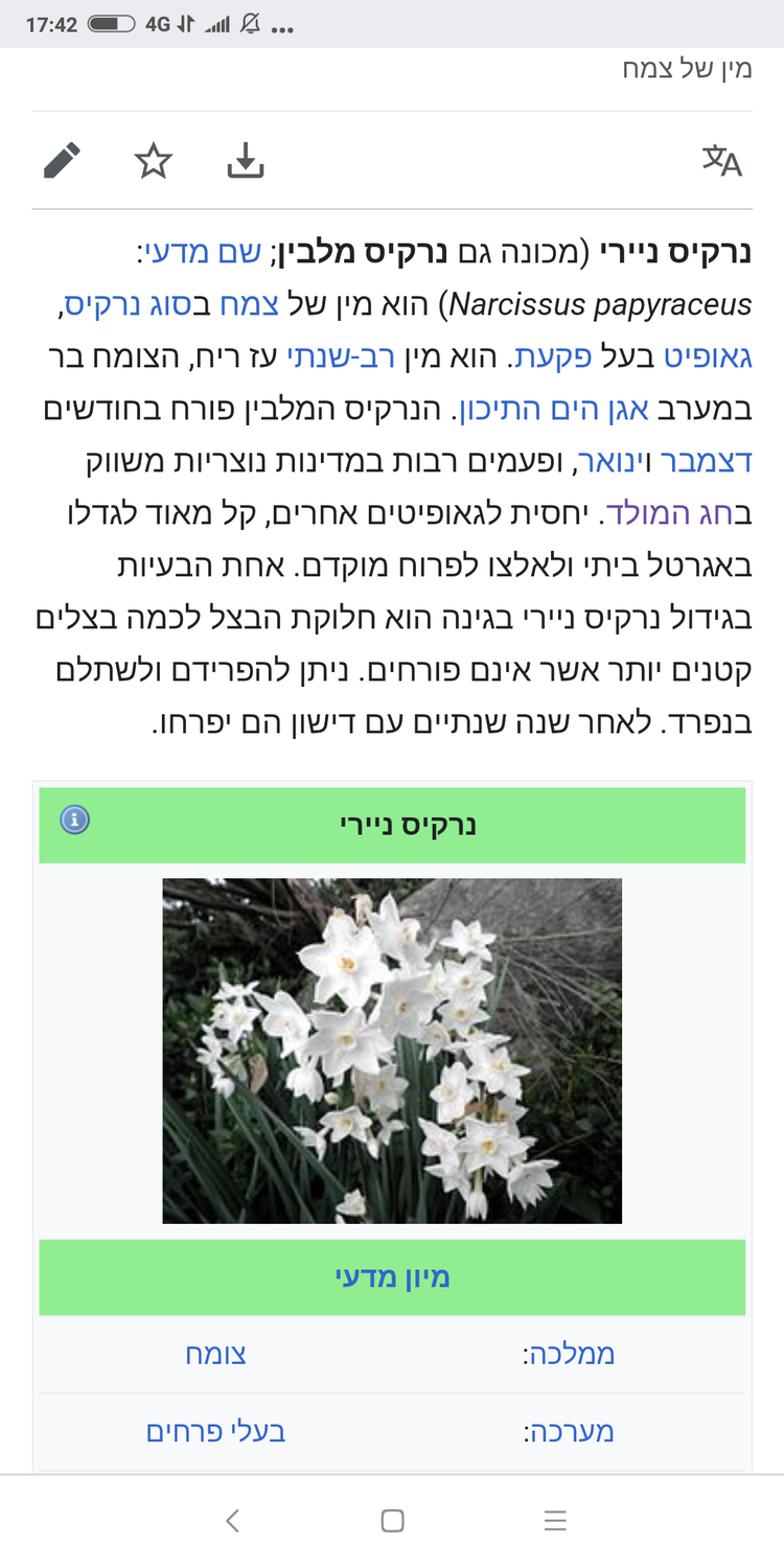 - לפי הצילום נראה כנרקיס ניירי ומכונה גם נרקיס מלבין. הוא פרח נוי יאיר