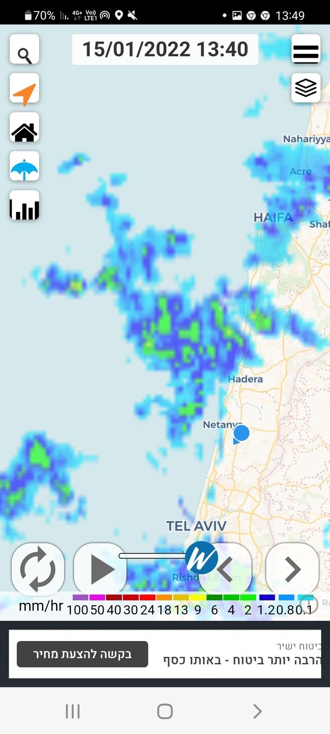 - גשמים חזקים במבלך הלילה מספר פעמים. כעת בהיר ללא גשם אך במכם נראה גל נוסף בדרך אלינו שי נתניה