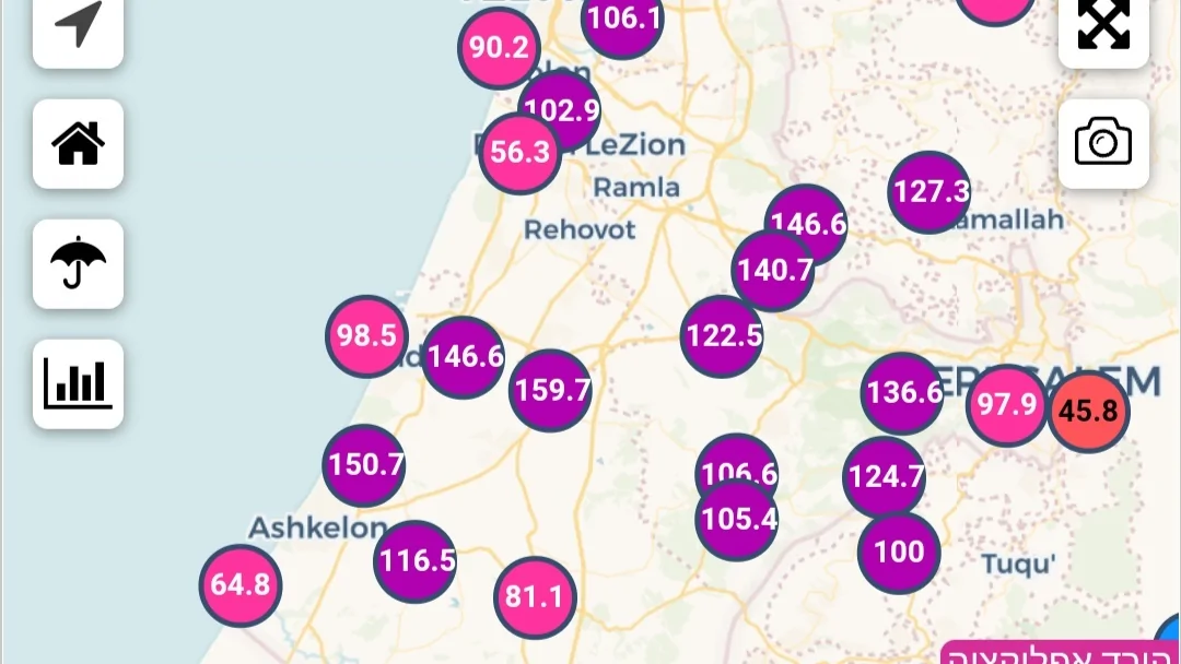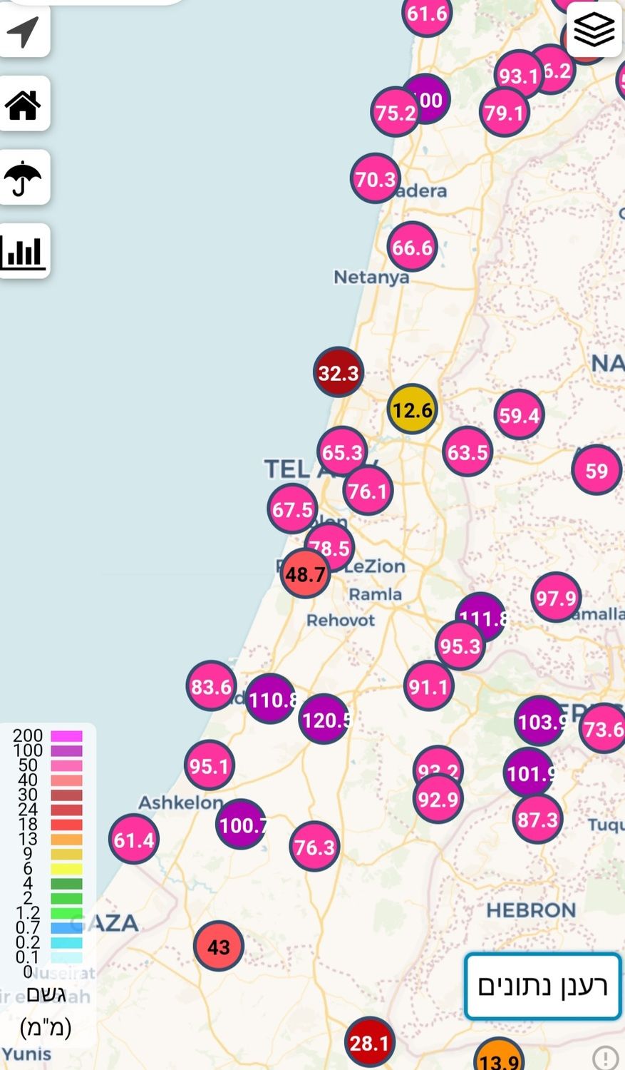 תחנות נגבה ומודיעין מתקרבות ל-100 מ"מ. תחנות בקו אשקלון-ירושלים, הכרמל הדרומי ואצבע הגליל גם הן מדדו קרוב ל-90 מ"מ.