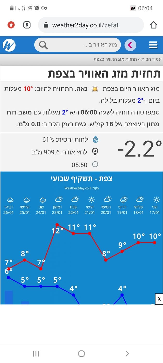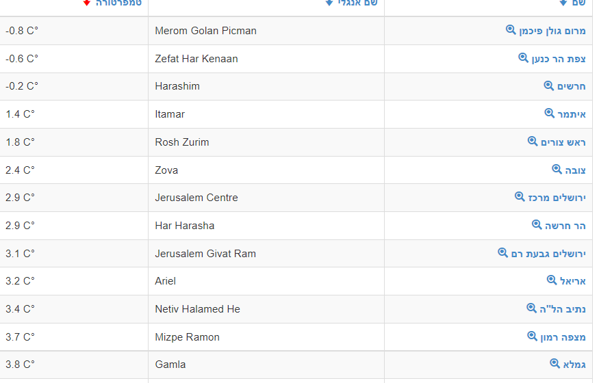 - מעט קריר בחרמון : עם מינוס 6.2 - צפת: 0.6 - ירושלים חם בהחלט עם 3 דובי