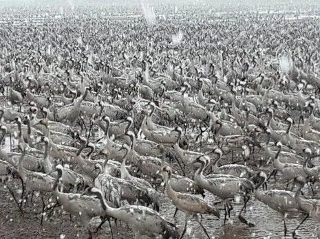 ירד שלג בעמק החולה. פעם אחת לפנות בוקר, ופעם השניה בין 9 ל10 בבוקר שם צולמו העגורים בשלג