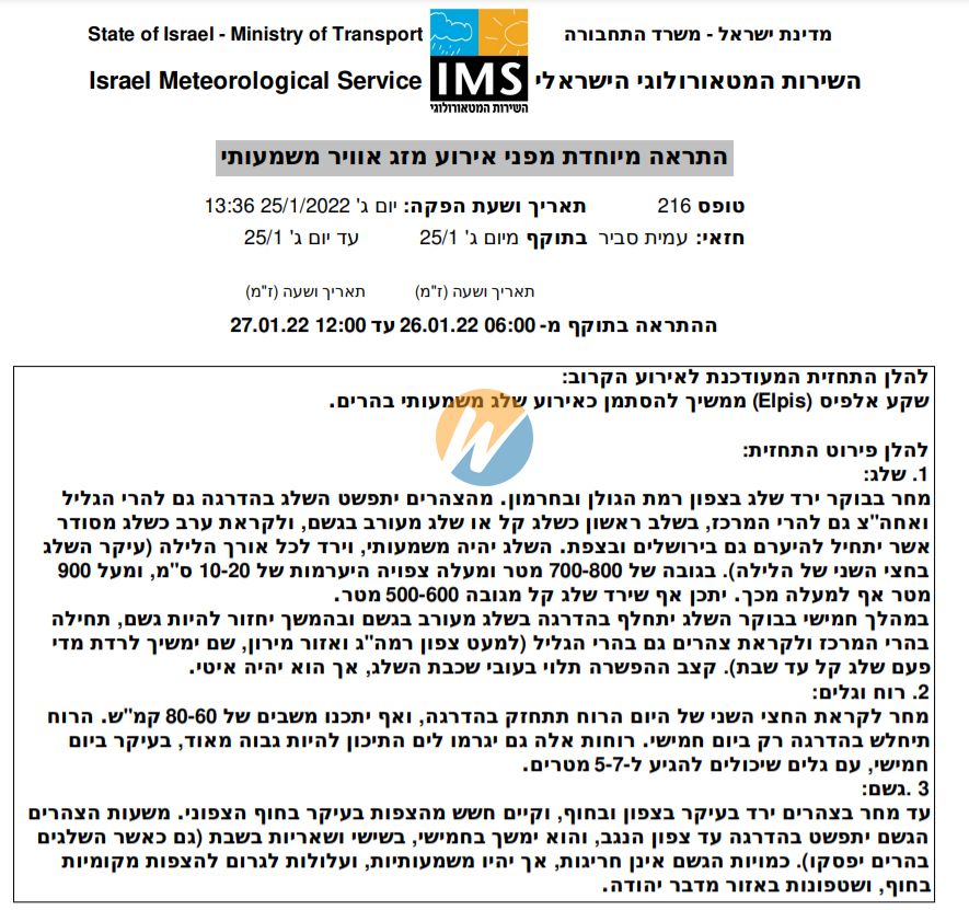 - השירות המטאורולוגי: התראה מיוחדת מפני אירוע מזג אוויר משמעותי - שקע אלפיס (Elpis) Weather2day