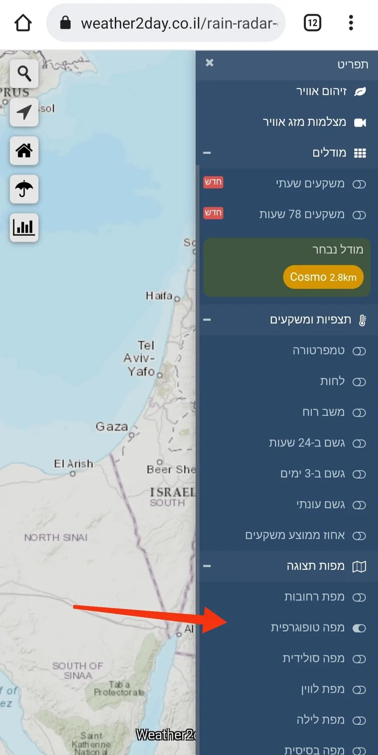 לתשומת ליבכם, במפת מזג האוויר שלנו בתפריט יש מפה טופוגרפית אפשר להשתמש בה למדידת הגובה