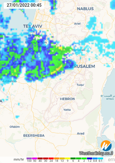 ביתר האזורים סוער וגשום. רכבות של גשם עושות את דרכן דרך מישור החוף המרכזי-דרומי לירושלים. לילה מושלג צפוי בבירתנו :)