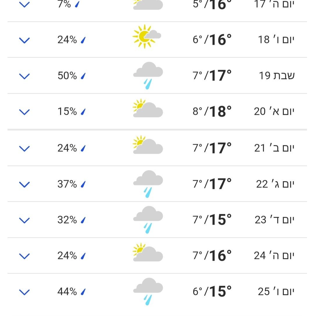 יום שלישי ( 15.02.22 ) : בהיר עד מעונן חלקית עם סיכוי לטפטופים/גשם נקודתי קל מאוד בעיקר בצפון ובחוף, בערב ובלילה ללא גשם. הטמפ' ללא שינוי. הרוח מערבית עד צפונית מערבית קלה עד מתונה.