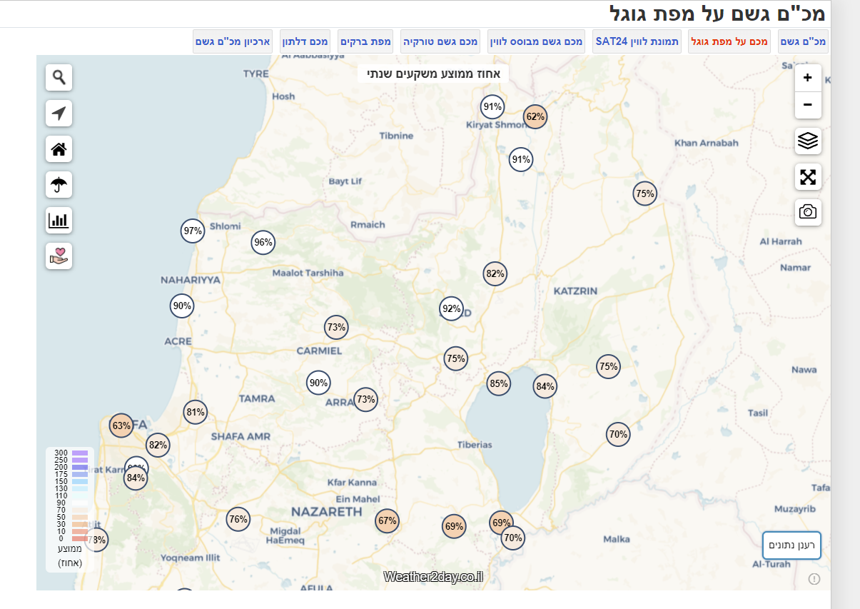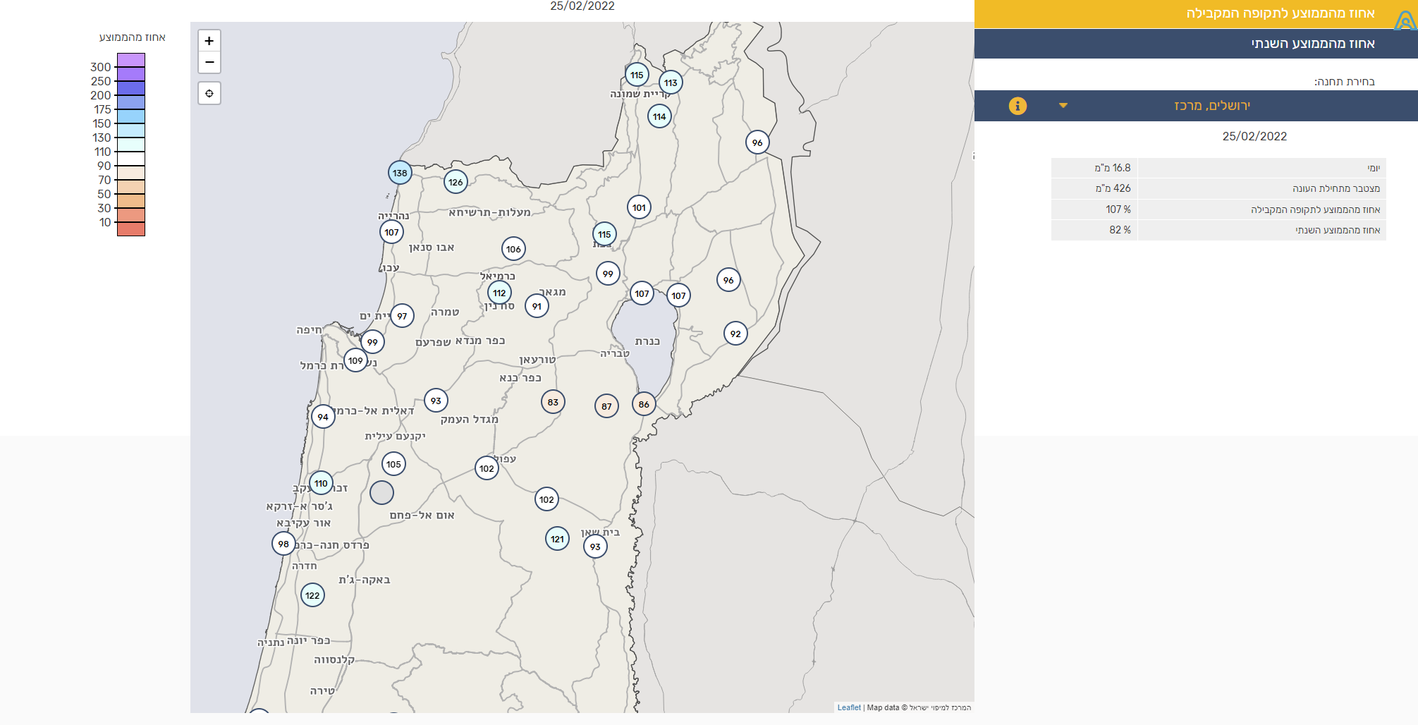 שימו לב לרמת הגולן שעמדת על 70-75% מהממוצע בלבד, כאשר נותר עוד כחודשיים לסוף עונת המשקעים, ורוב המשקעים העונתיים מאחורינו