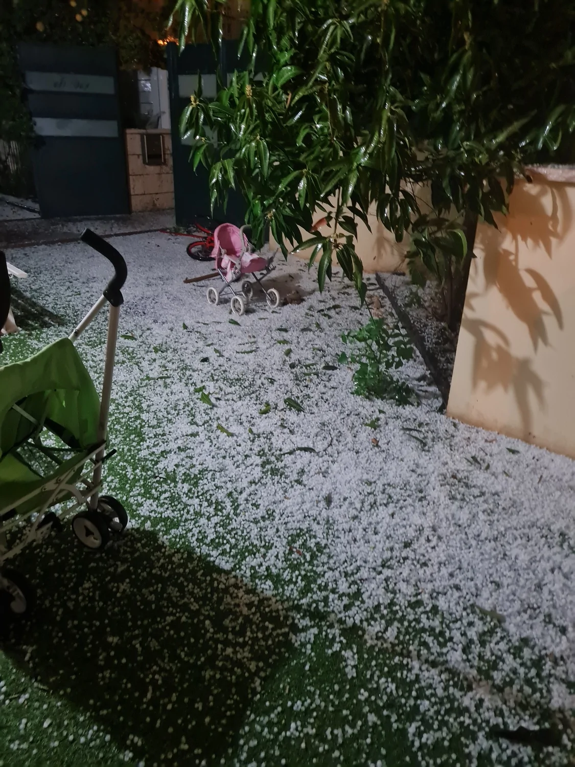 בקריות ירד ברד בעוצמות וכמויות שמעולם לא ראיתי, נערם על הדשא לגובה, כמו שלג בשוודיה