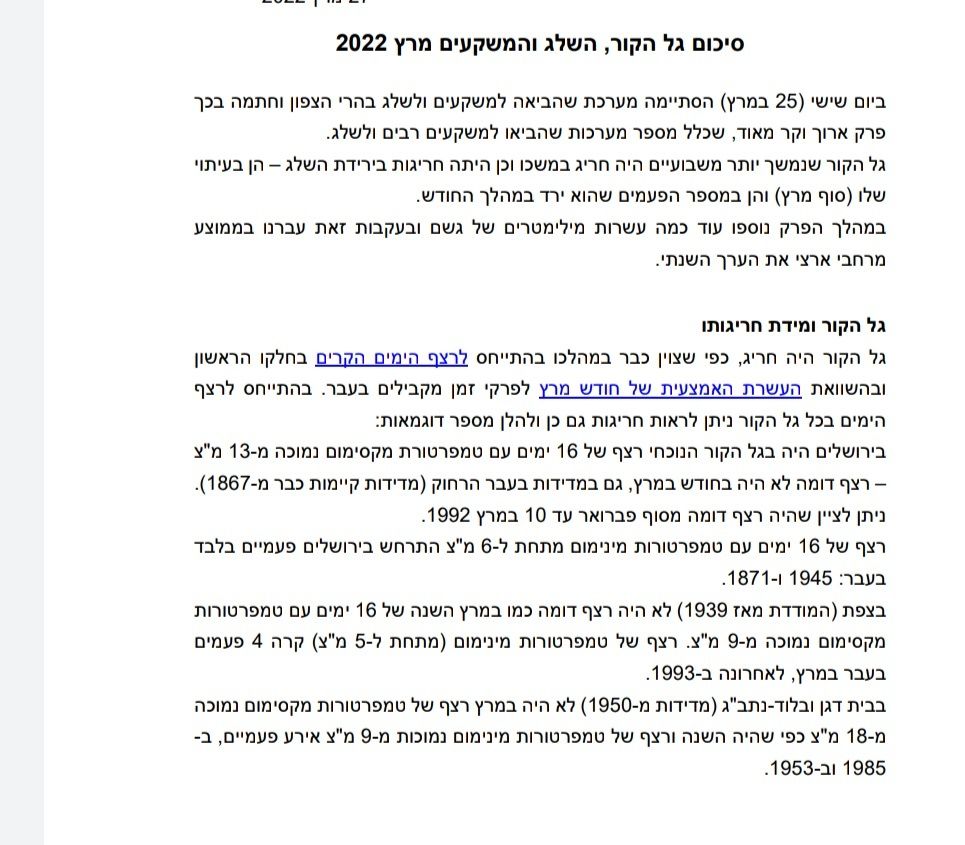 מערכת טובה מאוד לסוף חודש מרץ. נראה שהצלחנו לסחוט ממנה גשמים יפים בתפרוסת יחסית נרחבת למרות קו החיתוך הרציני שראינו במפות המשקעים לפני תחילת המערכת.