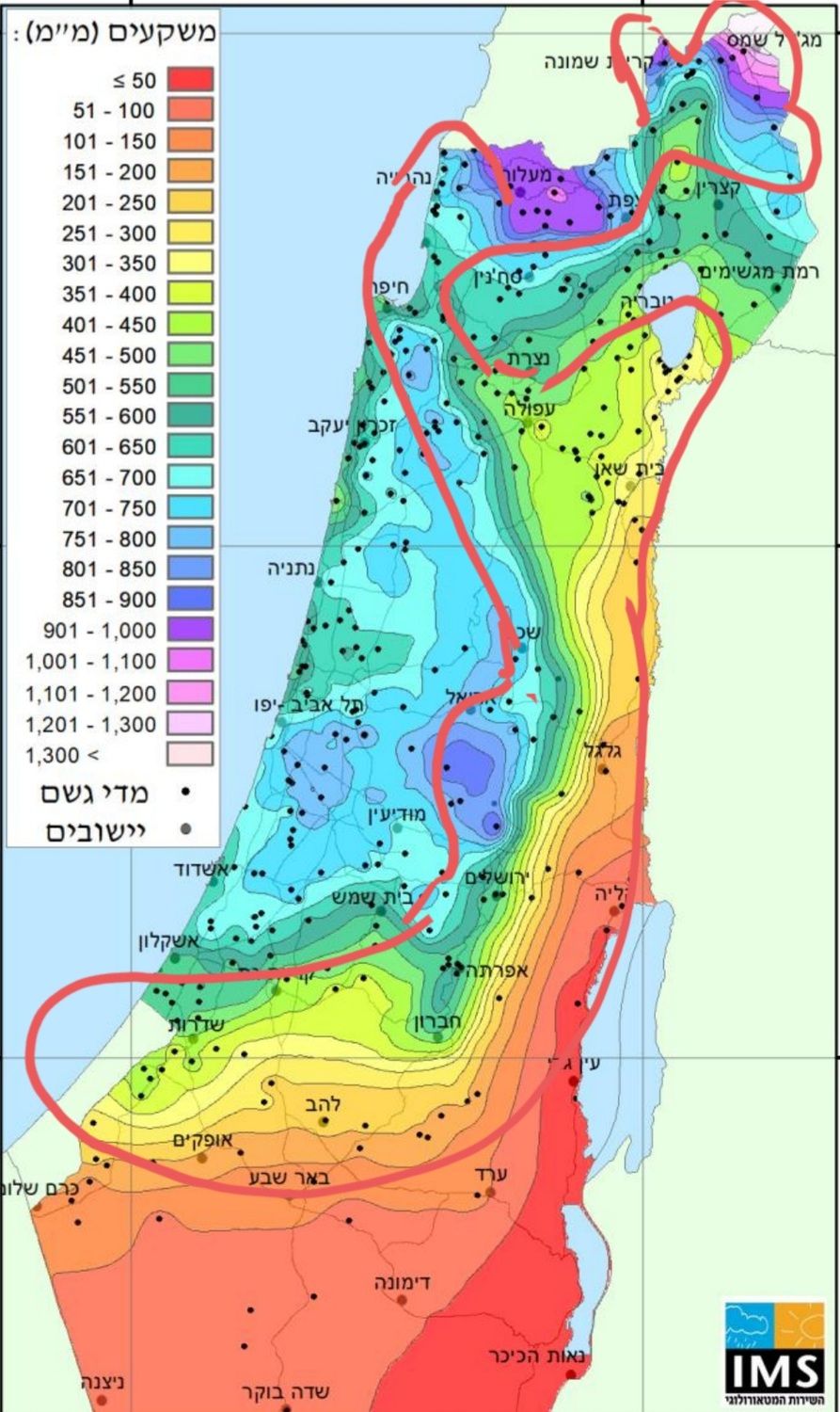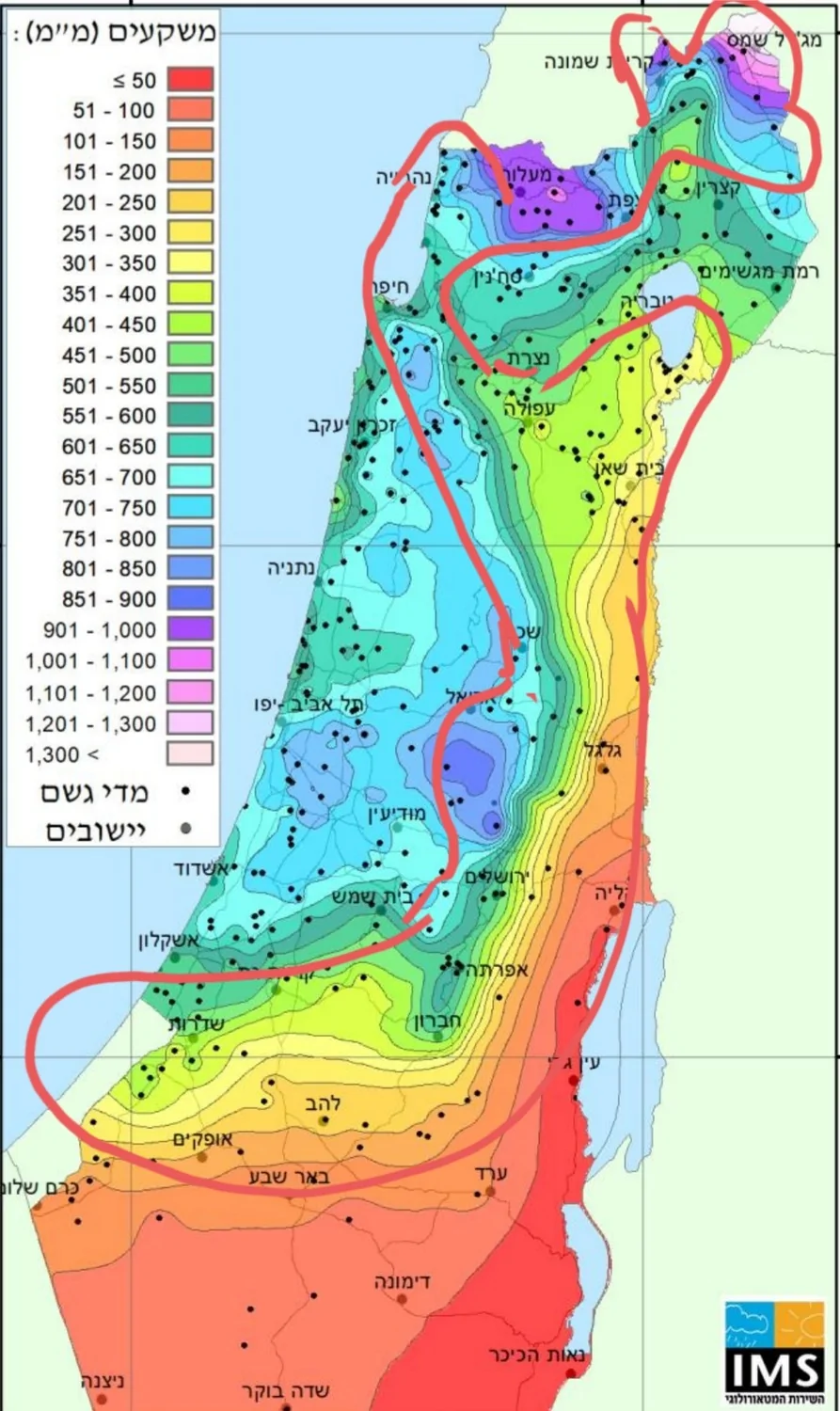 סימנתי בערך את האזורים בהם כמויות המשקעים שונות באופן קיצוני יחסית. ניתן לראות מעין "S" שנוצרת. קראתי לה "קו פרשת הגשם" כי שם נוצרים הפרשי משקעים קיצוניים כמו שקו פרשת המים יוצר את הפרשי המשקעים (אך כאמור, הקו לא תואם במדויק את קו פרשת המים).
