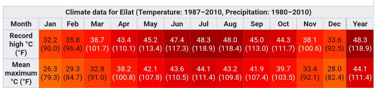 - לא מעודכן לספטמבר: בספטמבר 2020 נמדדו שם 48.9° (הכי גבוהה באילת אי פעם)