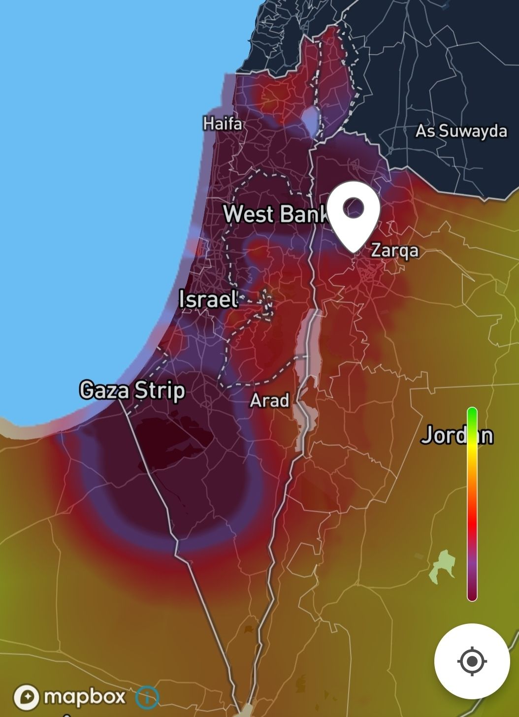 ממפת זיהום אויר עכשוית (בריזומטר) רואים בבירור זיהום חמור שמרוכז רק מעל ישראל. שימו לב שמעל ירדן, לבנון ומצרים האויר הרבה פחות מזוהם. יש למישהו הסבר ?