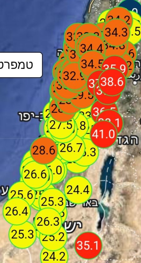 - הטמפרטורה הגבוהה ביותר היום, עין גדי 41.9°C בשעה 14:40 Weather2day