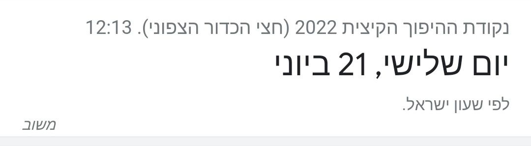 היום יום הארוך ביותר והלילה הקצר ביותר השנה וממחר הימים יחלו להתקצר מיום ליום והלילות יחלו להתארך גם כן מיום ליום