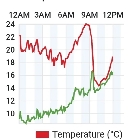 28 מעלות עם 70% לחות, נקודת טל של 22°.